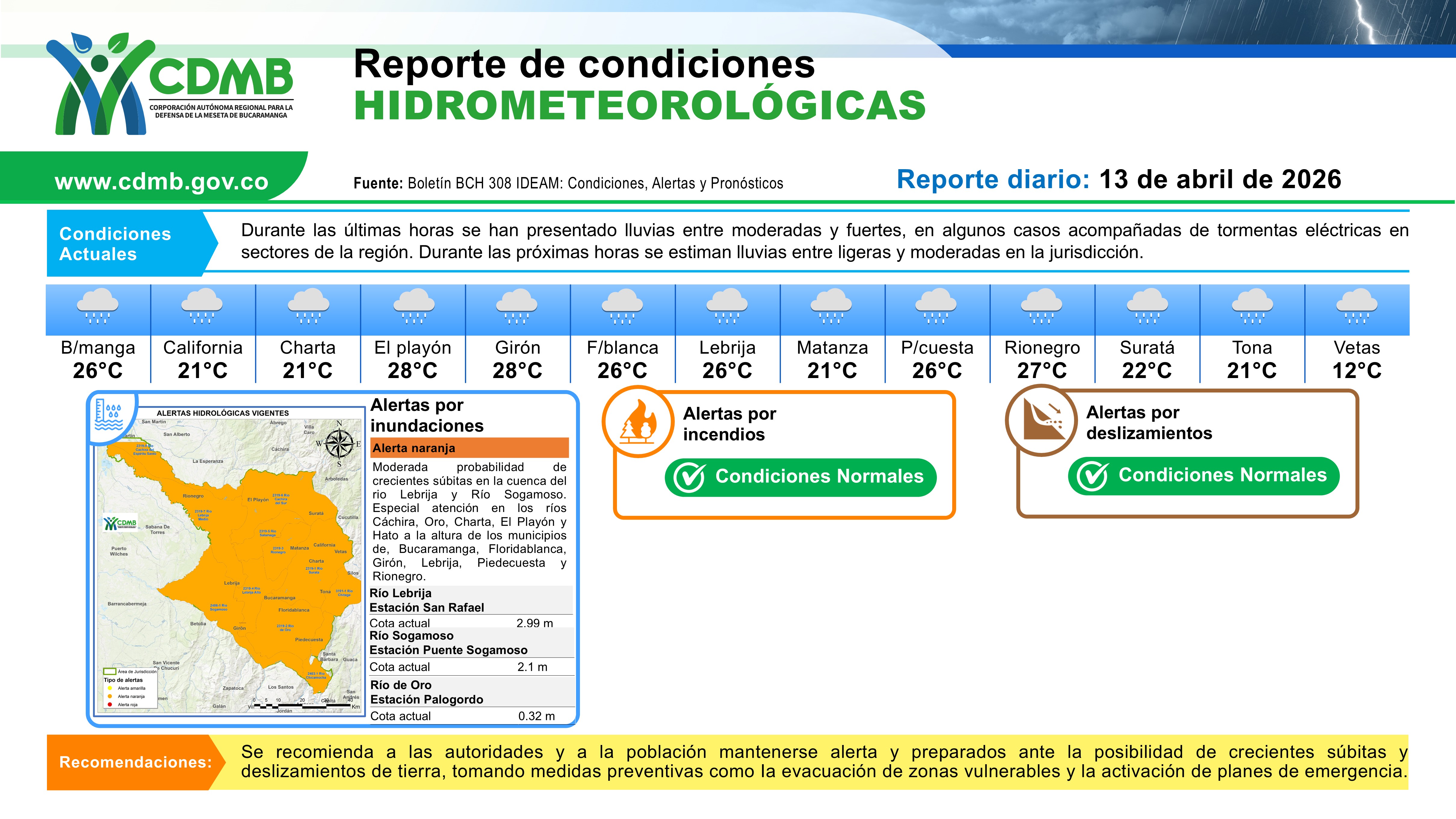 Reporte Alertas Hidrometereologicas 13 de abril 2026