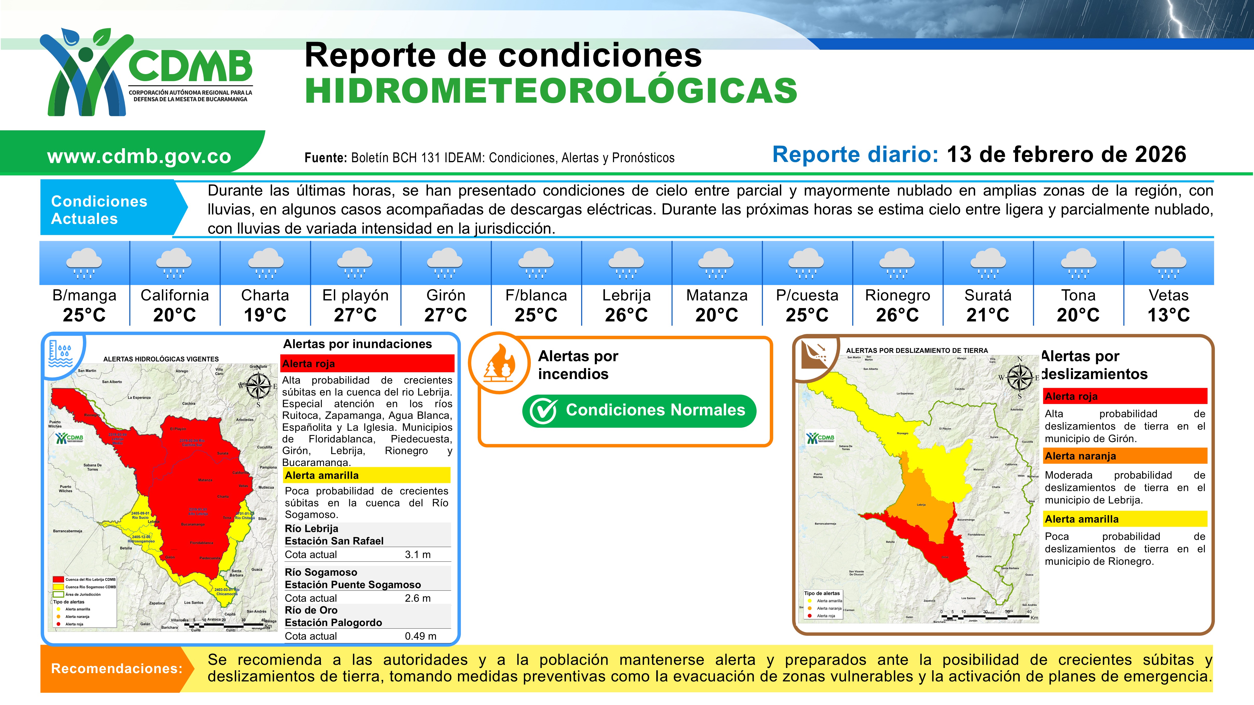 Reporte Alertas Hidrometereologicas 13 de febrero 2026